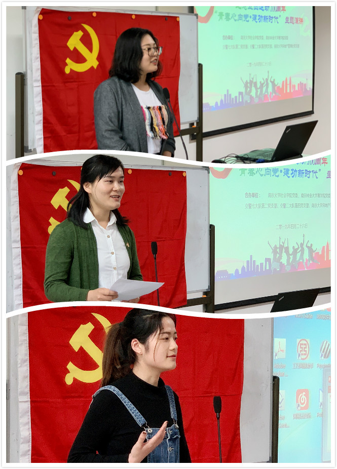 本科生党支部王雨路同学以“青春与责任”为主题,与大家交流了她对历史境遇与青年人责任之间关系的解读;最后,南京林业大学理学院学生党支部的秋慧同学,带来“青春新时代 共筑中国梦”的主题演讲,她从所学专业出发,展望以中国梦激活青春梦,去书写无愧于时代篇章的远大抱负。